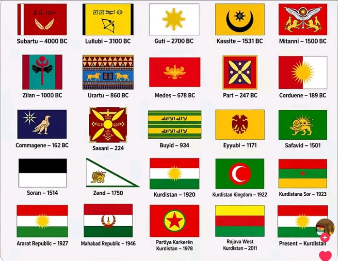 Subartu, Lullubi, Gutians, Kassiten, Mitanni, Urartu, die Meden (verwandt, aber nicht kurdisch), das Parthische Reich, das Sassanidenreich, die Safawiden-Dynastie und die Ayyubiden-Dynastie sind NICHT kurd